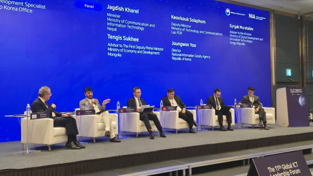 काठमाडौँ, २६ कात्तिक । सञ्चार तथा सूचना प्रविधिमन्त्री जगदीश खरेलले ‘ग्लोबल आइसिटी लिडरसिप फोरम’ नेपालका लागि उपलब्धिमूलक रहेको बताएका छन् । गणतन्त्र कोरियाको सिओलमा आज आयोजित ११ औँ ‘ग्लोबल आइसिटी लिडरसिप फोरम’ लाई सम्बोधन गर्दै उनले डिजिटल नेपाल र डिजिटल ट्रान्सफरमेसनका लागि लिडर्सिप फोरम उपलब्धिपूर्ण र फलदायी भएको उल्लेख गरे । उनले भने, “डिजिलट लिडर्सिप फोरम एकदमै उपलब्धिपूर्ण र सफल भएको छ, यसले आगामी दिनमा डिजिटल नेपालको अवधारणामा आधारित भएर डिजिटल नेपालको रूपमा अगाडि बढाउन तथा एआईमैत्री नेपाल बनाउन फोरम फलदायी भएको छ ।”